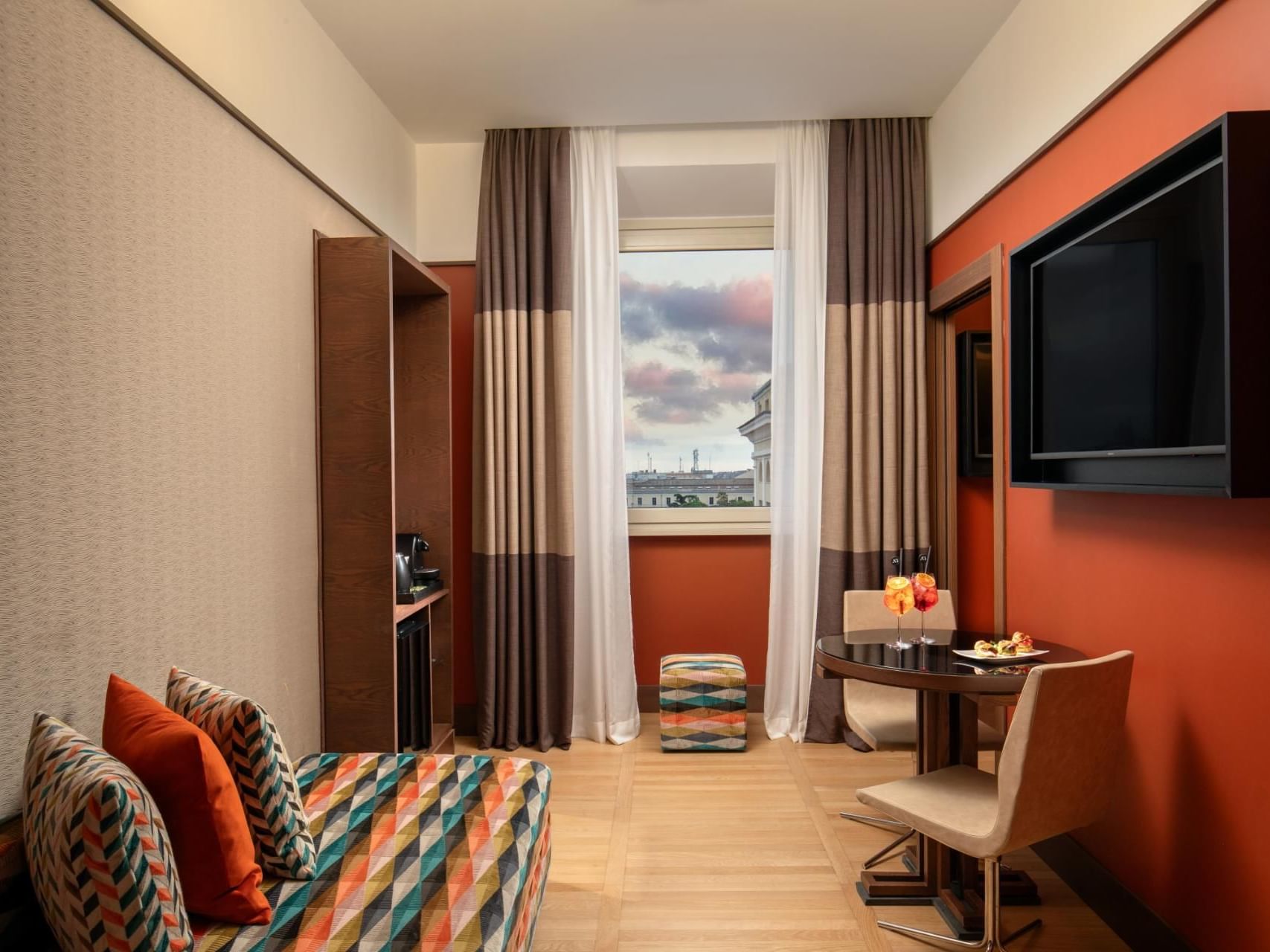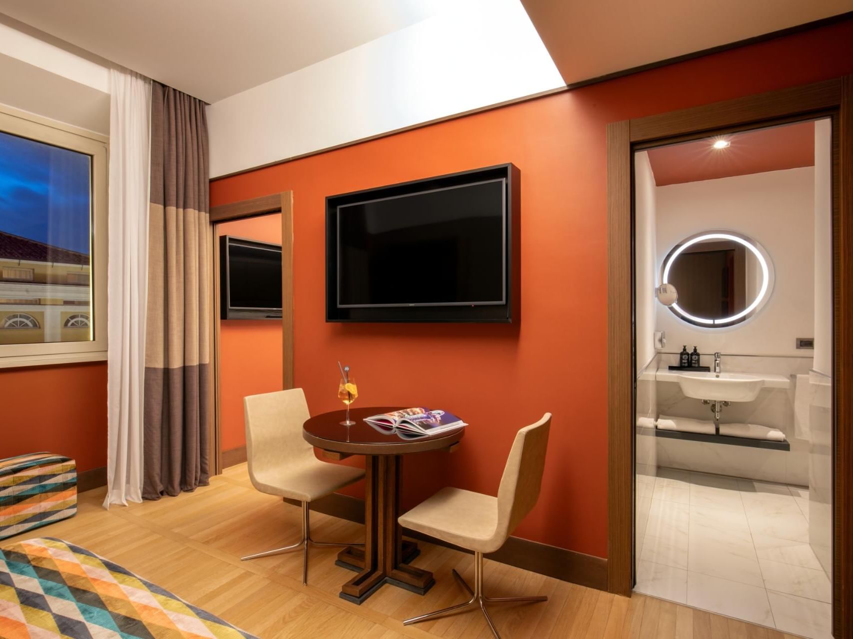 Scopri il perfetto equilibrio tra lusso e comfort nelle nostre spaziose Junior Suite. Progettate con particolare attenzione ai dettagli, queste eleganti camere sono arricchite da pavimenti in legno e da ampi letti king-size con materassi anallergici per una notte riposante. Il bagno elegante e raffinato è dotato di una grande doccia, soffici asciugamani in spugna e un set di cortesia pensato per lui e per lei. Tra i comfort premium trovi un minibar completamente rifornito, una TV HD da 42", Wi-Fi, un bollitore con una selezione di tè e infusi e una docking station per iPod/iPhone. La scelta ideale per chi cerca relax dopo una giornata intensa a Roma o una lunga giornata di lavoro.