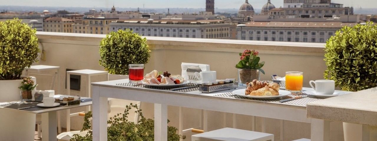 Sorseggia un cocktail al tramonto e lasciati incantare dall’atmosfera di Terrazza Cielo, il rooftop con vista a 360° su Roma.